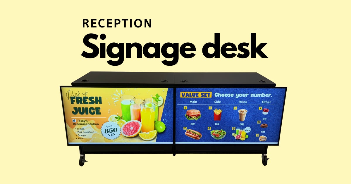 新商品「レセプションサイネージデスク」は、サイネージとデスクの機能をひとつにした2in1商品です。デスクの横に、看板やサイネージを別置きするより省スペースで設置が可能で、デジタル映像を放映しアイキャッチをとることができます。また、キャスターが付いており移動が可能です。常設のみならず、展示会や期間限定イベントなど幅広いシーンでご利用できます。