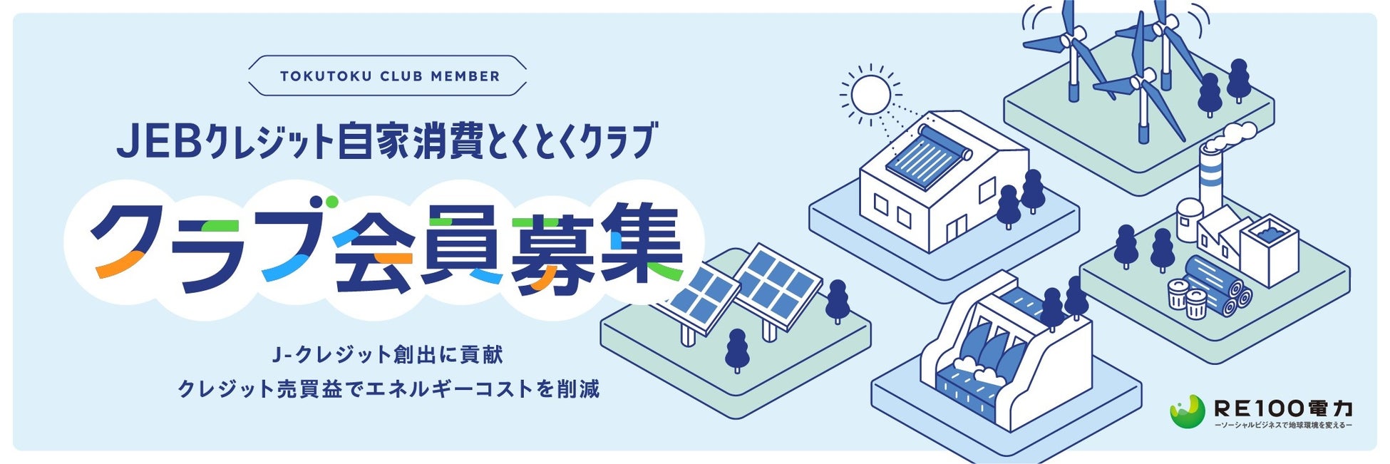 RE100電力は、J-クレジット制度のプロジェクト実施に伴い、「JEBクレジット自家消費とくとくクラブ」の入会者を募集しています。入会方法など詳しくは、下記URLよりお問い合わせください。