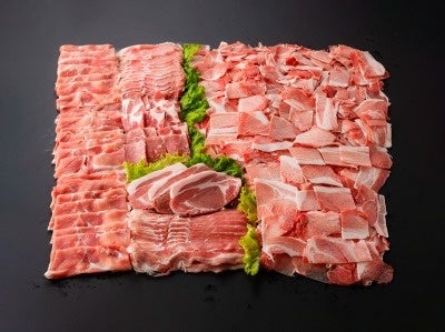 宮崎県産豚肉のバラエティーセットです。とんかつ用、焼肉用、しゃぶしゃぶ用などにカットした豚肉をセットにしてお届けしています。とんかつ用にカットされたロース肉は、とんかつだけでなくポークステーキとしてもお召し上がりいただけます。