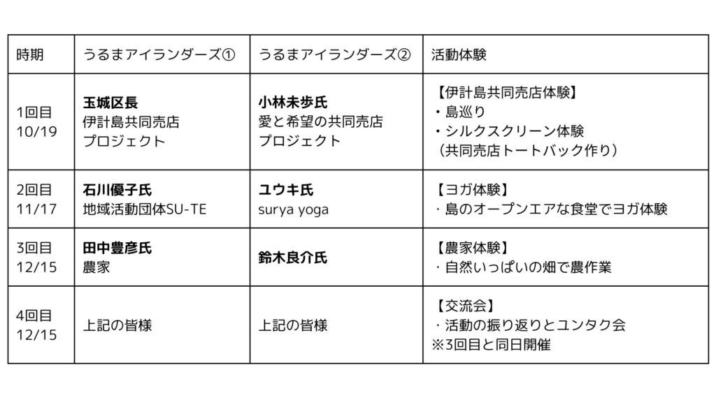 そこで、市は島しょ地域の活性化を図るために、地域活動に興味を持つ方々を増やす取り組みを行います。これに伴い、以下の体験プログラムが実施されます。詳細は「移住検討者向けWEBメディア「うるまで暮らす」」をご覧ください。