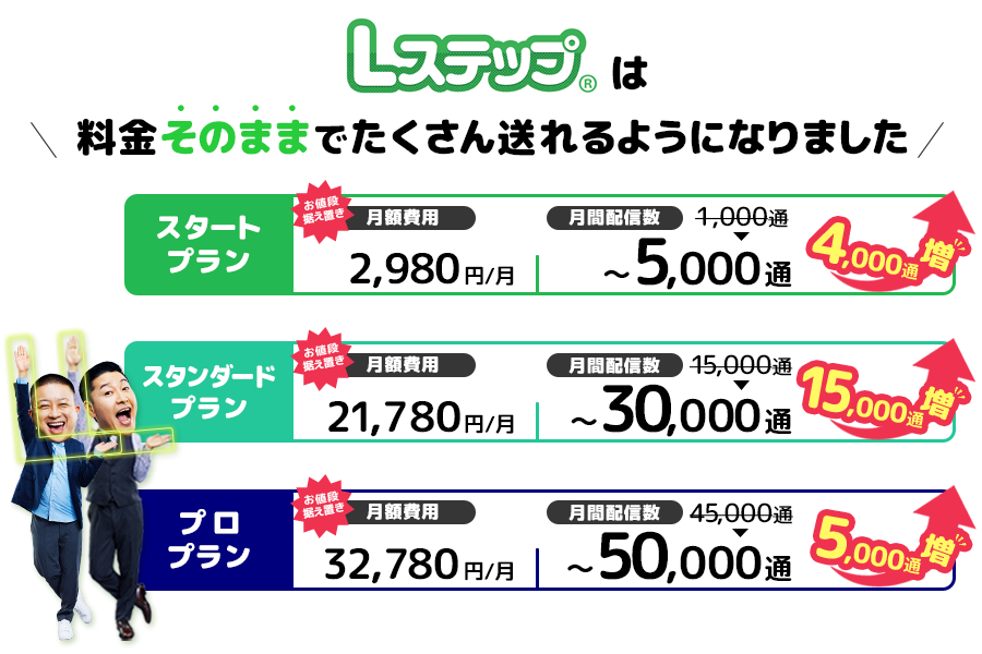 今回の月間配信数の拡大は、月額費用は現行と変わらないため、実質的な値下げにあたります。Lステップをより利用しやすくすることで、個人事業主や中小企業の皆様が様々な事業課題の解決を図り、ますますビジネスを加速できるように、との思いから実施したものです。