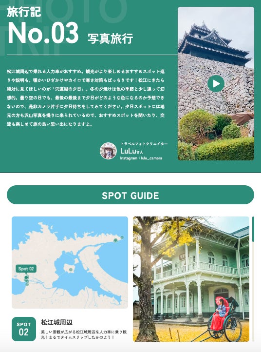 「Winter Trip to MATSUE」では、インフルエンサーのmikkoさん(ファミリーインフルエンサー)、 Yuriさん (トラベルフォトグラファー)、 LuLuさん(トラベルフォトクリエイター)計3組にご協力いただき、“冬に訪れたいスポット”をお届けいたします。