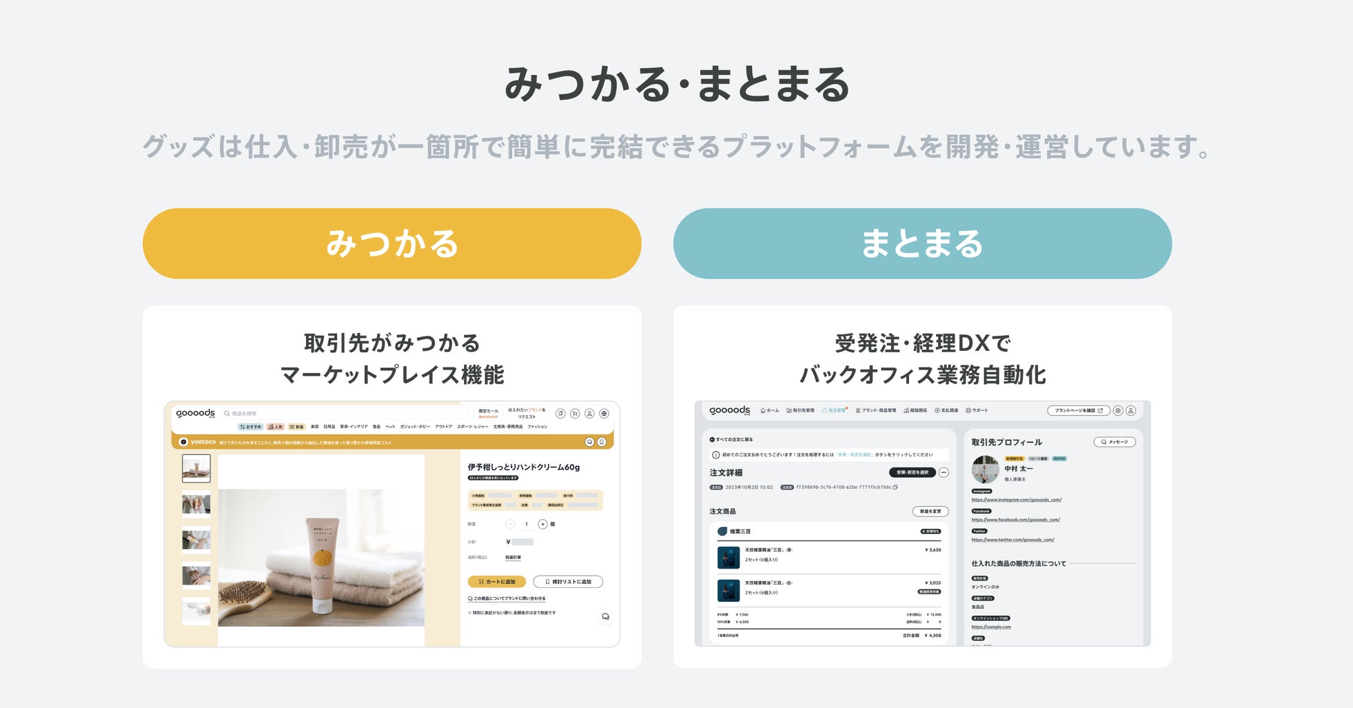 グッズは、巨大な卸売産業で新規取引先がみつかる「マーケットプレイス機能」、そして高度な受発注・経理業務DXで「バックオフィス業務自動化」を同時実現できるワンストッププラットフォームを提供しています。