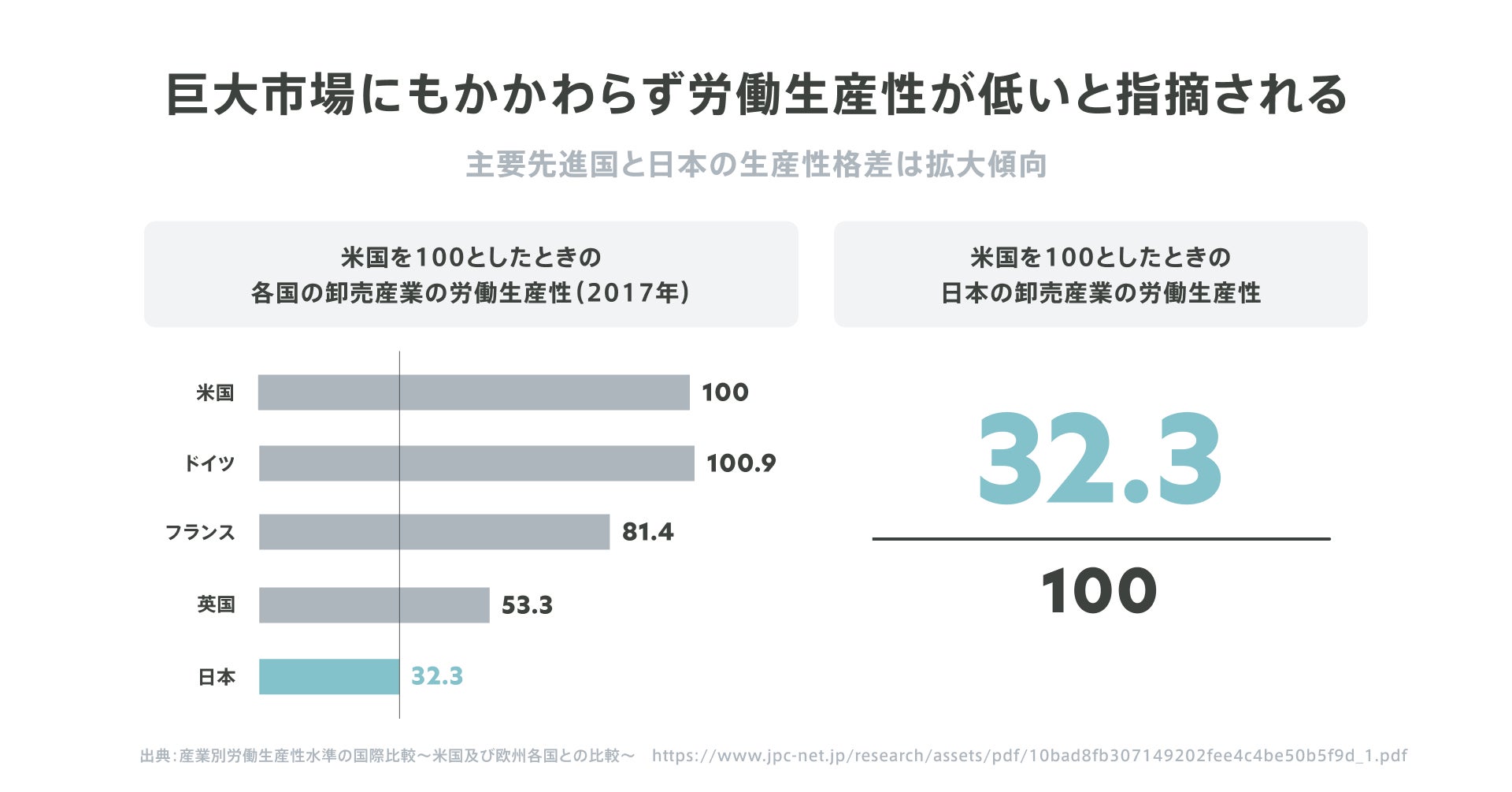 店舗・ECに並ぶ商品を仕入れて販売するB2B領域である卸売産業は、非常に裾野が広く、数兆円から数十兆円にも及ぶカテゴリが連なる巨大な産業です。米国を100としたときの労働生産性を示す基準は、3分の1程度とされており、デジタル化の普及による効率化の余地が多く残されています。