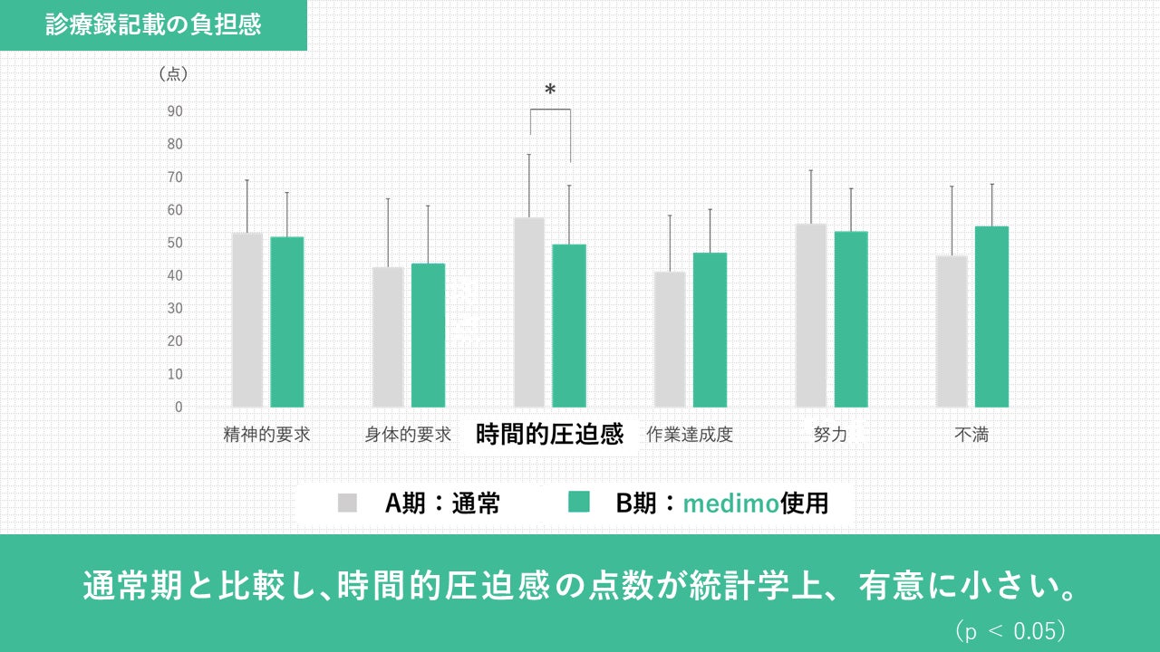 「medimoを用いた診療録作成」は、記録作成に伴う時間的圧迫感を軽減を認めました。