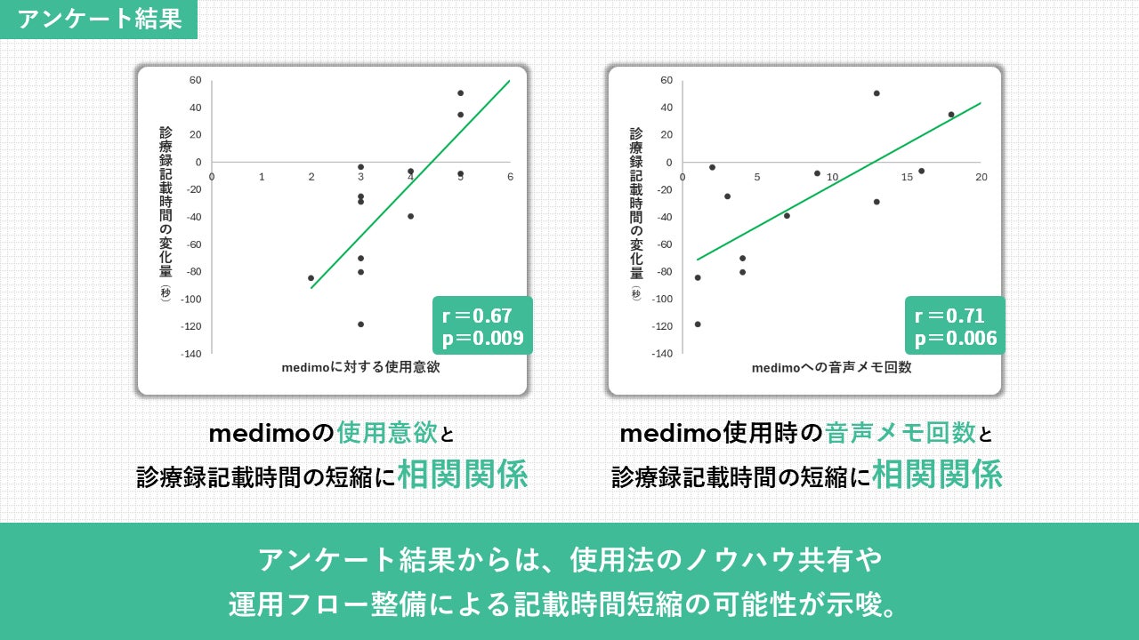 アンケート結果からは、medimoの使用意欲・音声メモ回数(音声をmedimoに吹き込む回数)が多いセラピストほど記載時間短縮と相関があることが分かり、使用法のノウハウ共有や運用フロー整備による記載時間短縮の可能性が示唆されました。