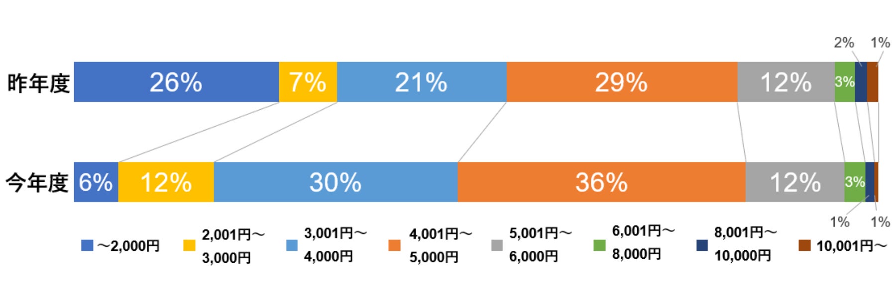 今年度の宴会予算として適切な価格帯は、66%が「3001円~5000円」と回答しています。また、昨年度の出費額と比較すると「~2000円」の価格帯が20pt減少し、「2001円~5000円」の価格帯が上昇していることから、今年度は、宴会に対する消費意向が増加していることがわかります。