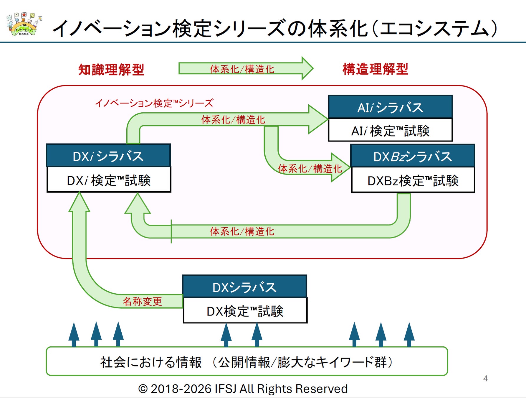 当学会では、2018年よりIT技術・ビジネスの基礎を問う「ITBT®検定」を、2020年よりDX推進人材を育成・評価する「DX検定™」を展開してまいりました。AIエージェント時代に入ったと言われる現在、産業界のみならずAI活用の領域が拡大し、イノベーション融合が起きやすい環境に進化しました。そこで、2026年4月より、イノベーション検定シリーズの一環として「DXイノベーション検定™(DXi 検定™)」を第一弾として販売開始しました。