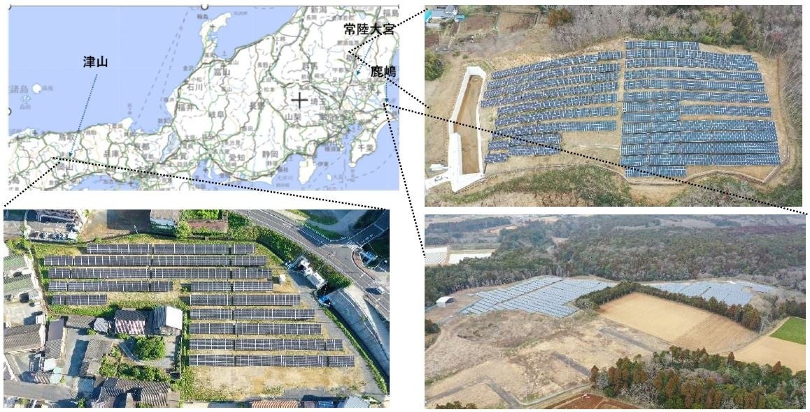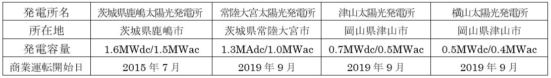 発電所名 | 茨城県鹿嶋 太陽光発電所 | 常陸大宮 太陽光発電所 | 津山太陽光発電所 | 横山太陽光発電所 |