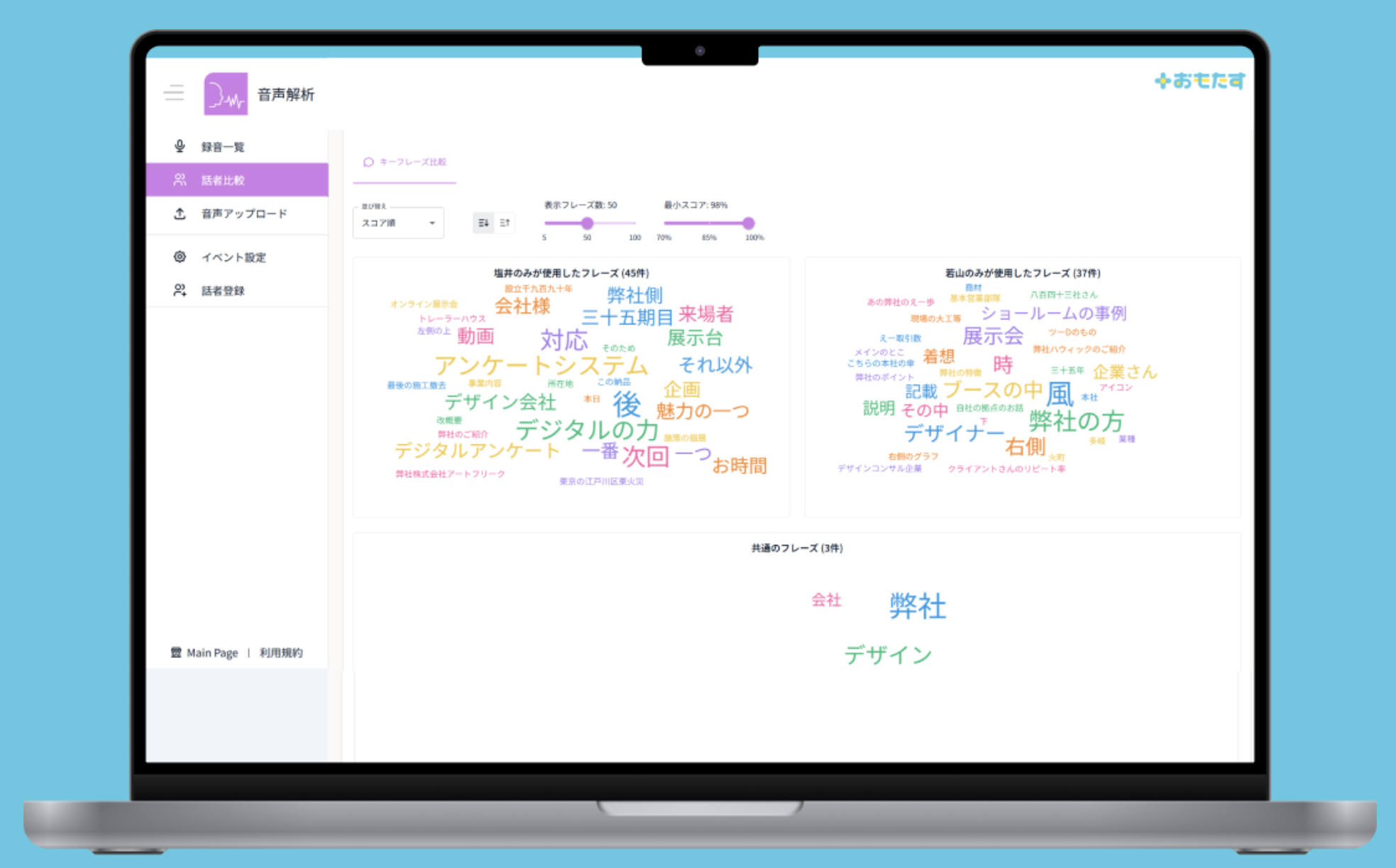 「おもたす」は、人流計測と音声解析、デジタルアンケートを組み合わせ、展示会やイベントの成果を最大化するためのマーケティング支援ツールです。