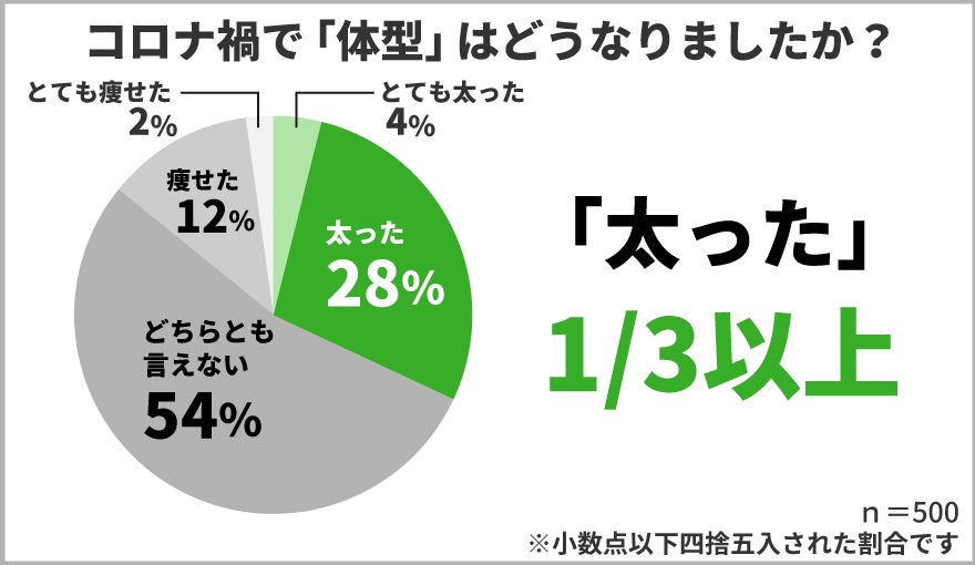 厚生労働省指定研究 NIPPON DATA.研究班の調査(「国民健康・栄養調査対象者の疫学研 究 NIPPON DATA2010 の追跡調査結果」)の結果でも、2020年4月~5月のコロナ第一波が流行中に体重が1kg以上増加した人の割合は約3割と出ているようです。