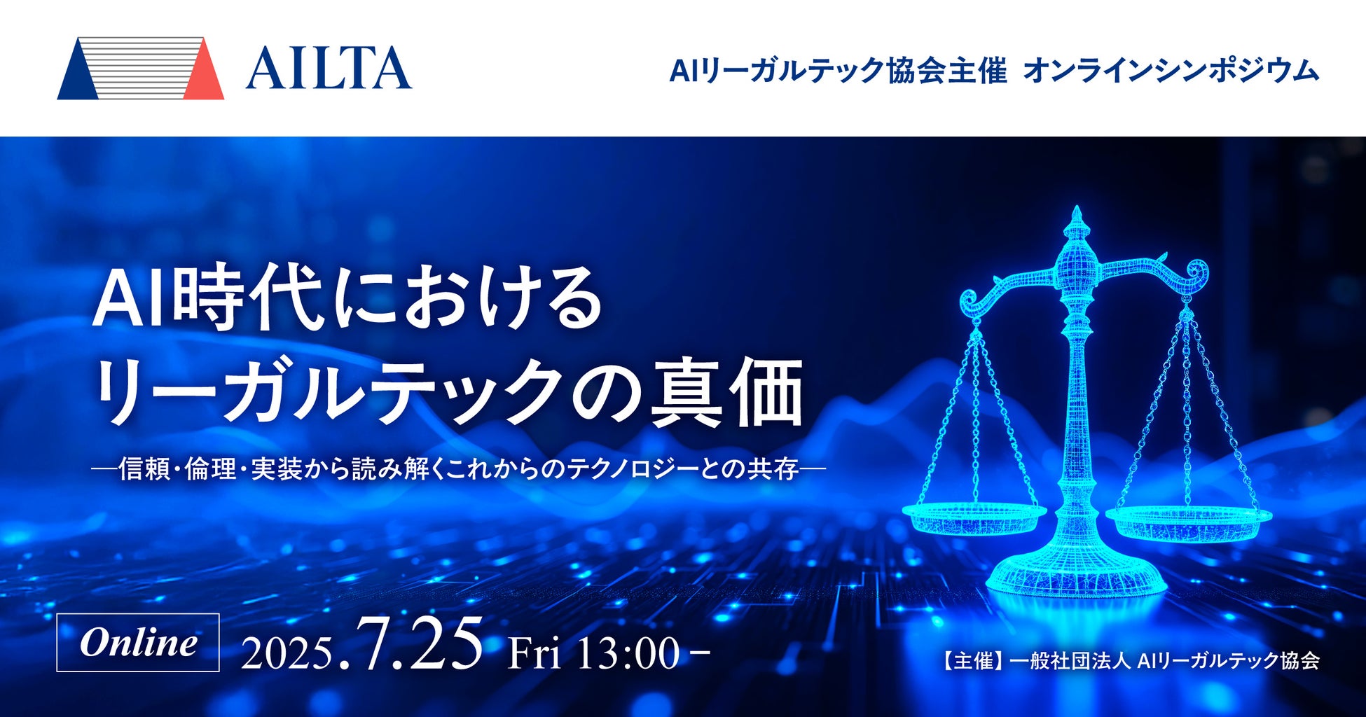一般社団法人AIリーガルテック協会(主たる事務所:東京都渋谷区、代表理事:松尾 剛行、英名:AI LegalTech Association、略称:AILTA)は、2025年7月25日(金)13時より「AI時代におけるリーガルテックの真価―信頼・倫理・実装から読み解くこれからのテクノロジーとの共存―」をオンラインで開催いたします。