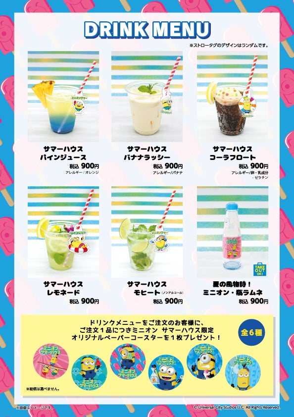 このコラボ実施にあたり、イルミネーションとNBCユニバーサルによって“夏を楽しむミニオンたち”を表現する様々な新アートが開発されました。それらの中には、“日本の夏”をテーマとした日本オリジナルアートも多数含まれており、かき氷や花火といった夏の風物詩を満喫したり、風鈴や金魚すくいで夏の涼をとるミニオンたちの姿が描かれています。カフェの店内装飾のみならず、フードやグッズなどでもこれらの新アートが多数使われていますので、是非店頭でチェックしてみてください。