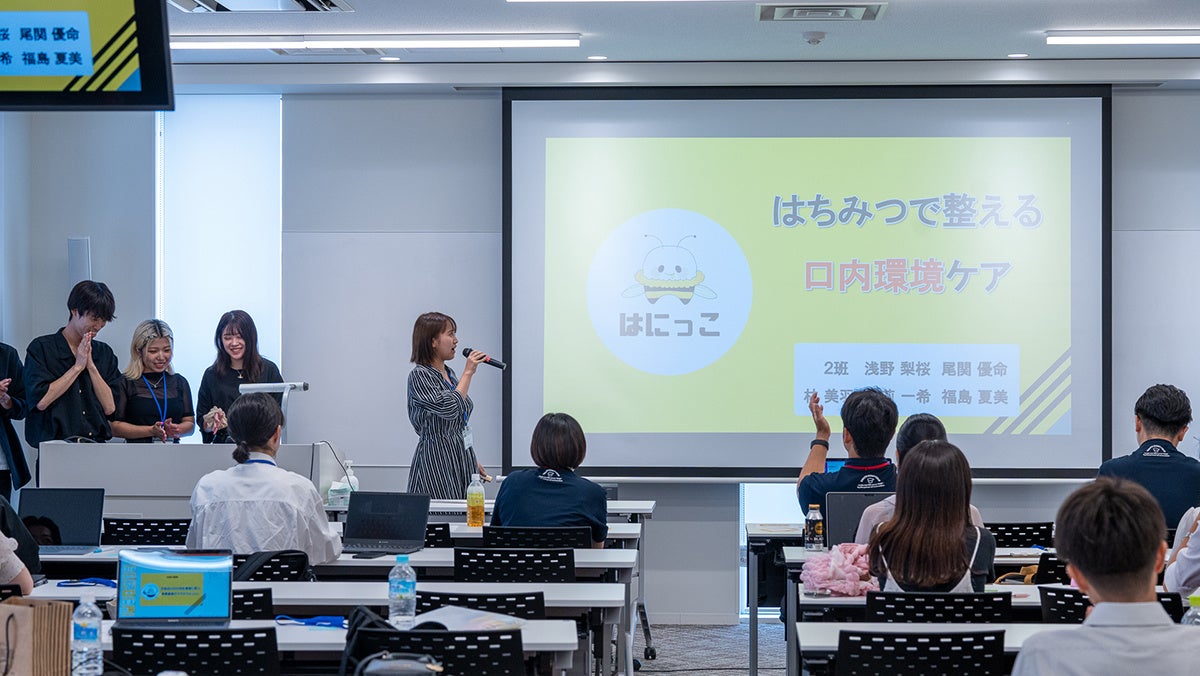 プレゼンテーションでは、はちみつを砂糖の代わりに活用したポーション入り調味料「はにポ!」や、はちみつビネガードリンクの素をウォーターサーバーが設置されている企業や施設に提供する「BEE TO PROJECT」、はちみつを活用したキッズコスメ「HACHI MEETS」、大切な人に気持ちを伝えるはちみつギフト「ハッピーハニー」といったユニークなアイデアが発表されるなか、優秀賞には、小さい子どもが食後すぐにデザート感覚で口内環境を整えられるはちみつを活用したマウスウォッシュ「はにっこ」が、敢闘賞にはスポーツ観戦やライブ鑑賞後ののどの負担を抑えるはちみつドリンク「うるっと」が輝きました。優秀賞に輝いた「はにっこ」は、今後の発売を目指してこの9月より、やまと蜂蜜と学生たちの間で実際に製品化を進めていくことが決定しました。