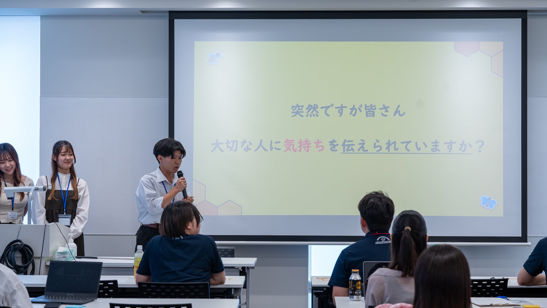 プロジェクトでは30名の学生が6チームに分かれ、新たな価値を創造し人を幸せにするビジネスアイデアを共創していきました。初日は大学のキャンパスにて、株式会社やまと蜂蜜の4代目代表・鳥居大嗣さんが講師となり、これまでの会社の歩みやはちみつ業界の課題、自社の強みといったお話をしていただきました。