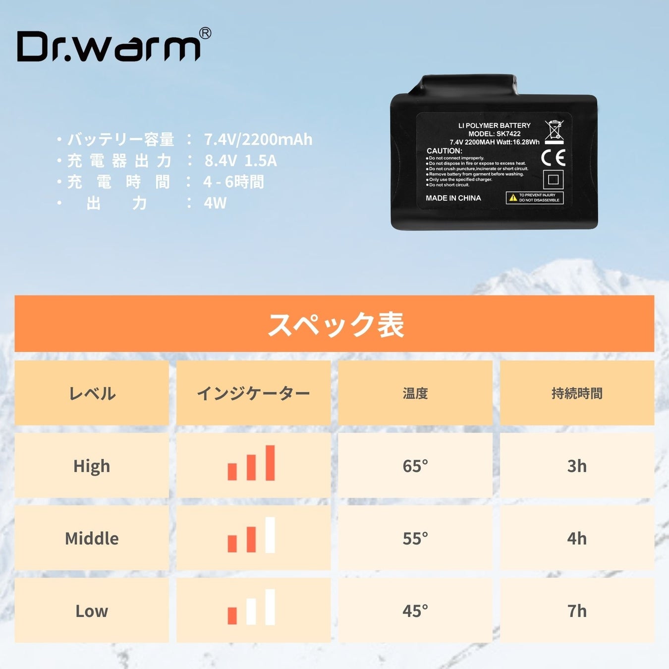 Dr. Warmの発熱グローブは、片手に2200mAhの大容量バッテリーを搭載しており、フル充電で約2.5時間から7時間の連続発熱が可能です。これにより、ウィンタースポーツや長時間のアウトドア活動中でも、バッテリー切れを心配することなく一日中指先を温かく保てます。充電時間は約4時間で、PSE認証も取得済みのため、安心して使用できます。