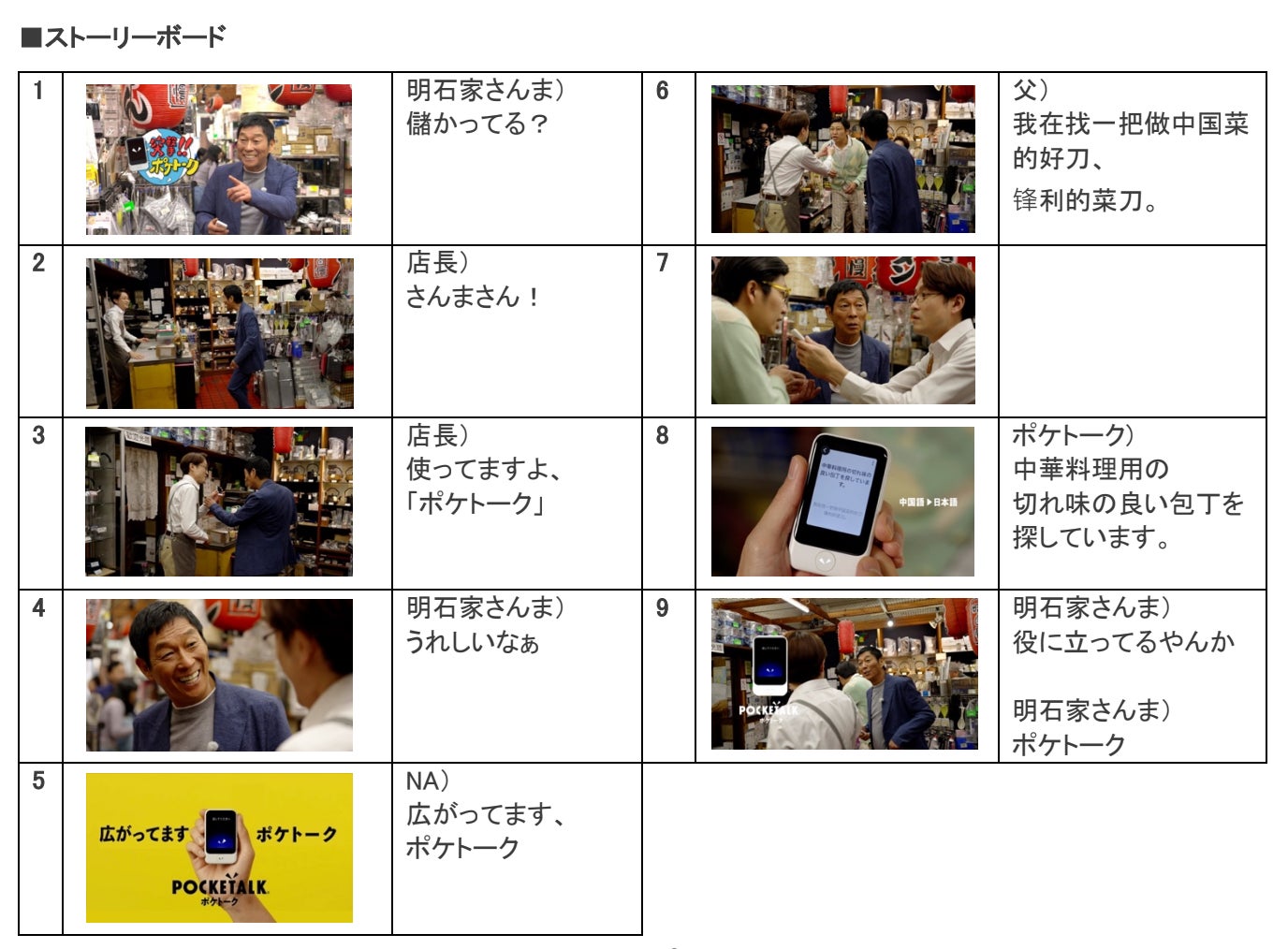 舞台は、外国人にも人気のある日本有数の商店街である「かっぱ橋道具街」。海外からの観光客の来店を期待して「ポケトーク」を導入していた店主のもとに明石家さんまさんが訪れると、調理器具を探しに訪れた中国人家族を店主が接客する場面に遭遇します。