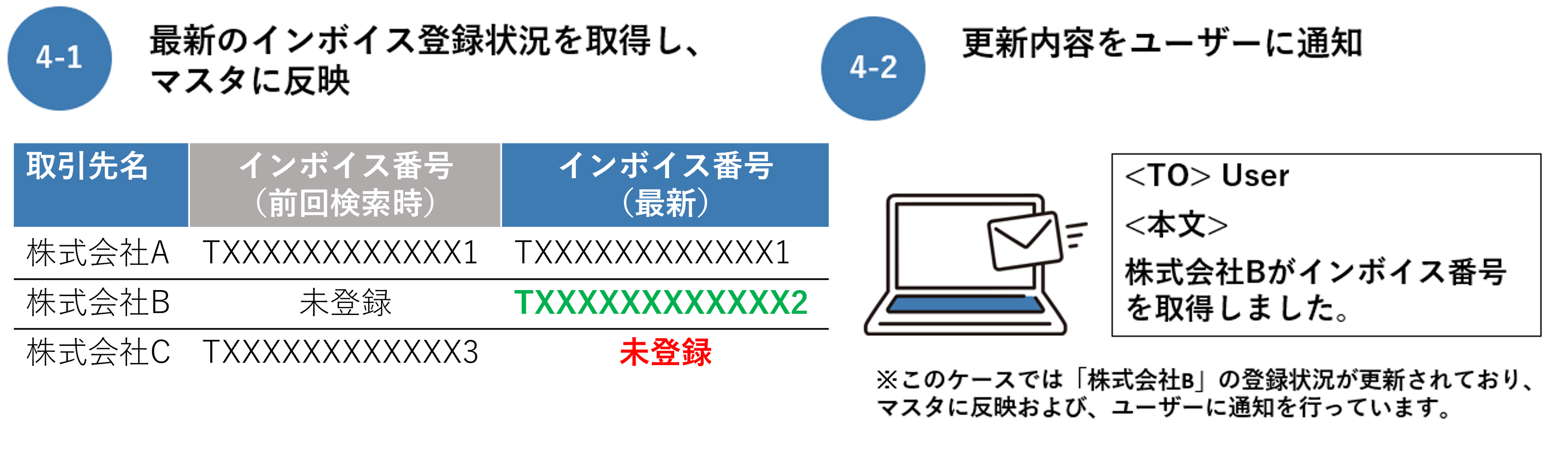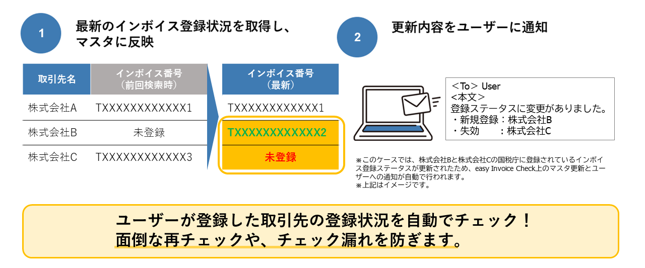 easy Invoice Checkで把握した取引先の登録情報をモニタリング対象として登録することにより、その後の登録ステータスの状況(※)を毎日、自動でモニタリングします。なお、easy Inovice Checkツール以外で取得したインボイス登録番号でも利用可能です。