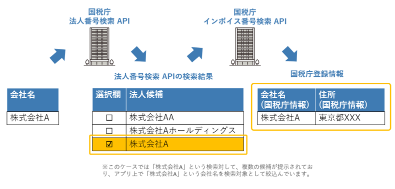複数候補からの取引先を特定できる絞込み機能搭載により、会社名だけで確認することも出来ます。
