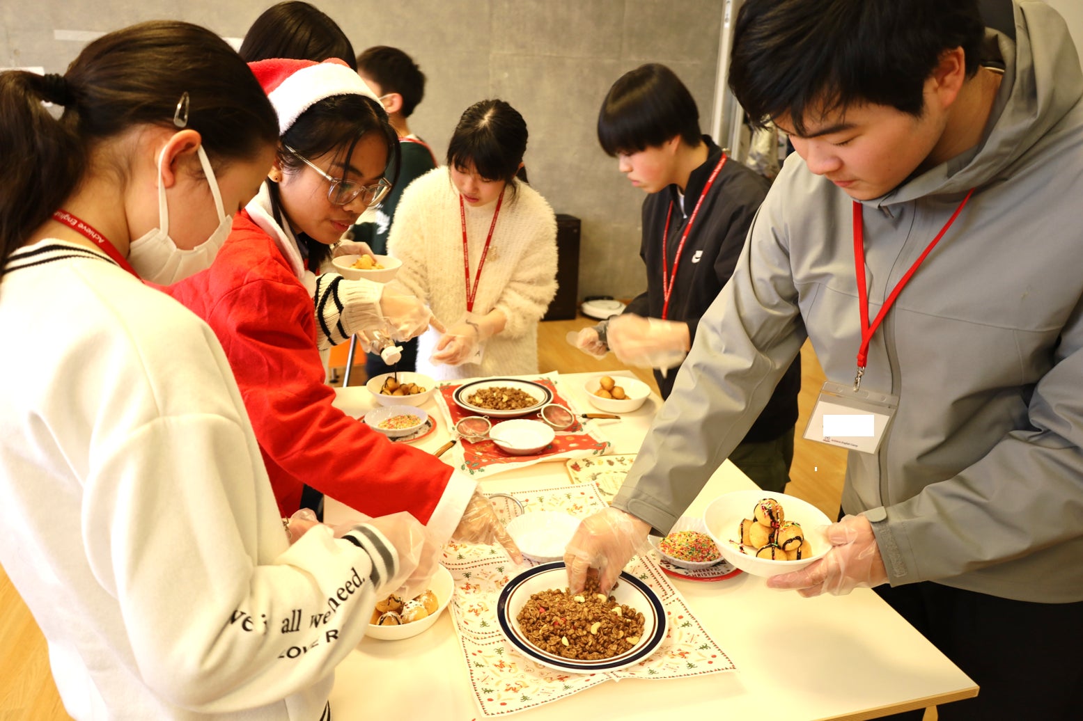 12月25日はクリスマスということで、サンタクロースの格好をした講師とミニシュークリームを積み上げて、オリジナルのシュークリームツリーを作成するアクティビティを特別に行いました🎄