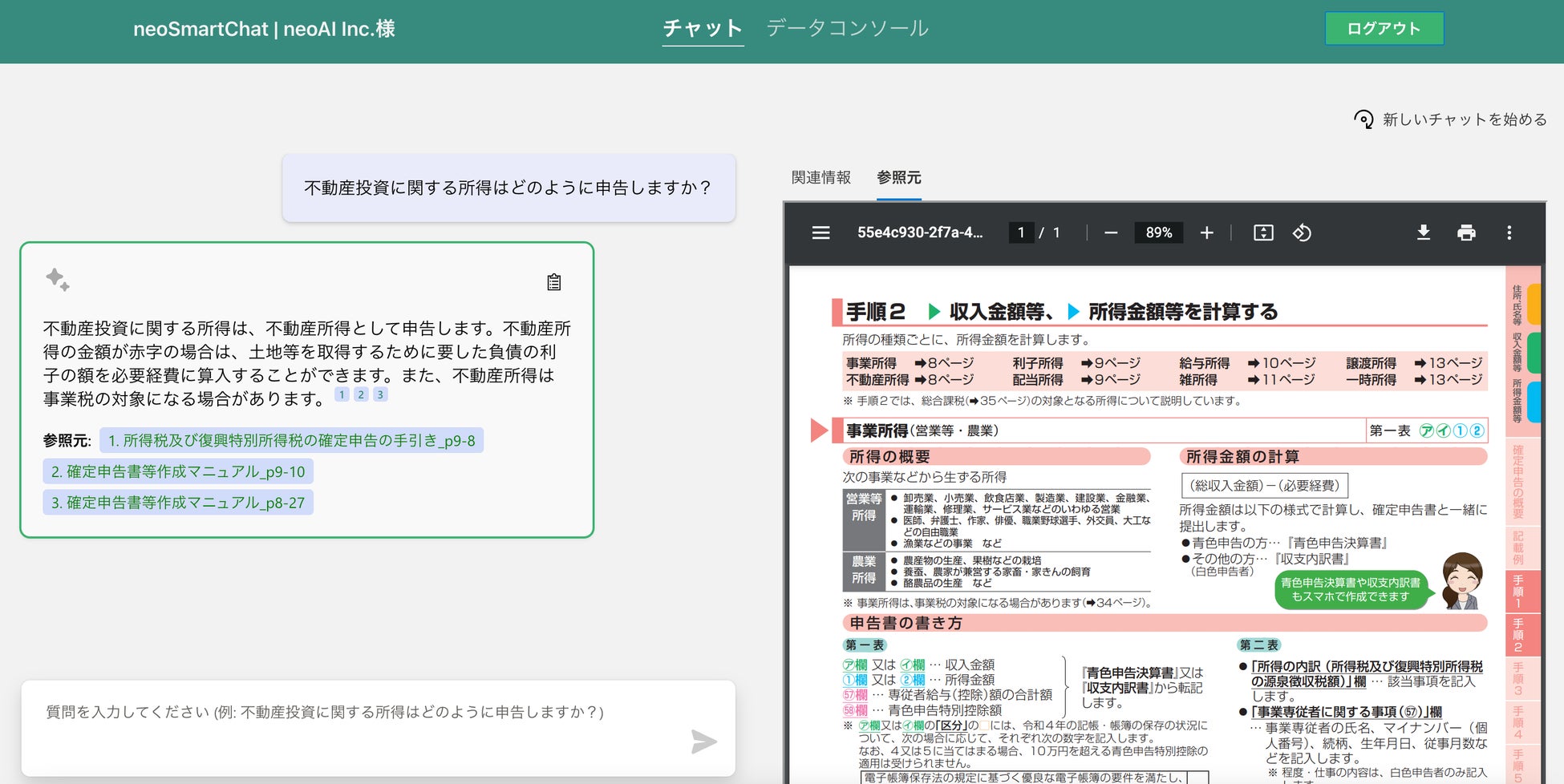 膨大な資料から対応する情報を抽出し、回答をする必要があるため、OpenAI社が提供するChatGPTをneoSmartChatを用いてカスタマイズし使用しました。