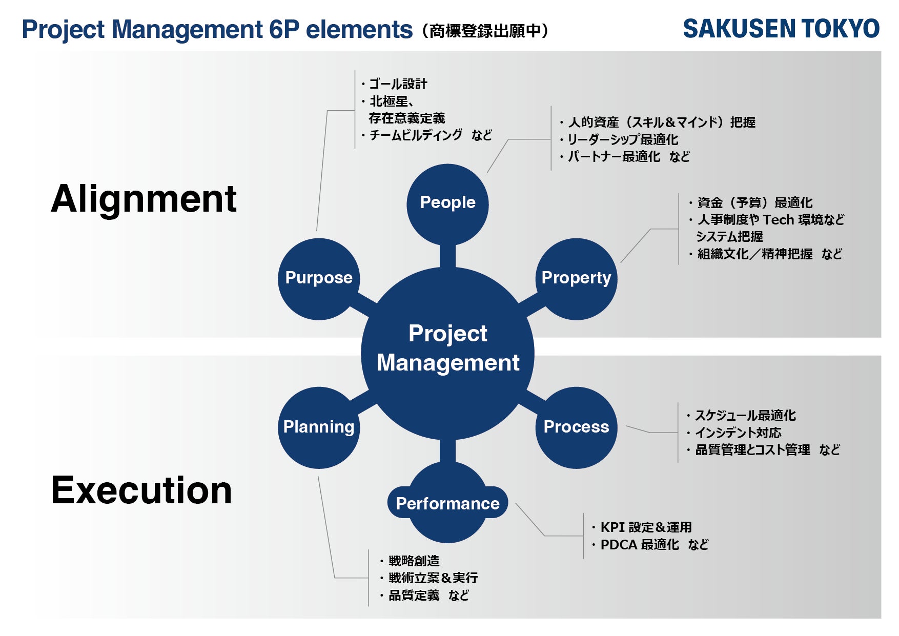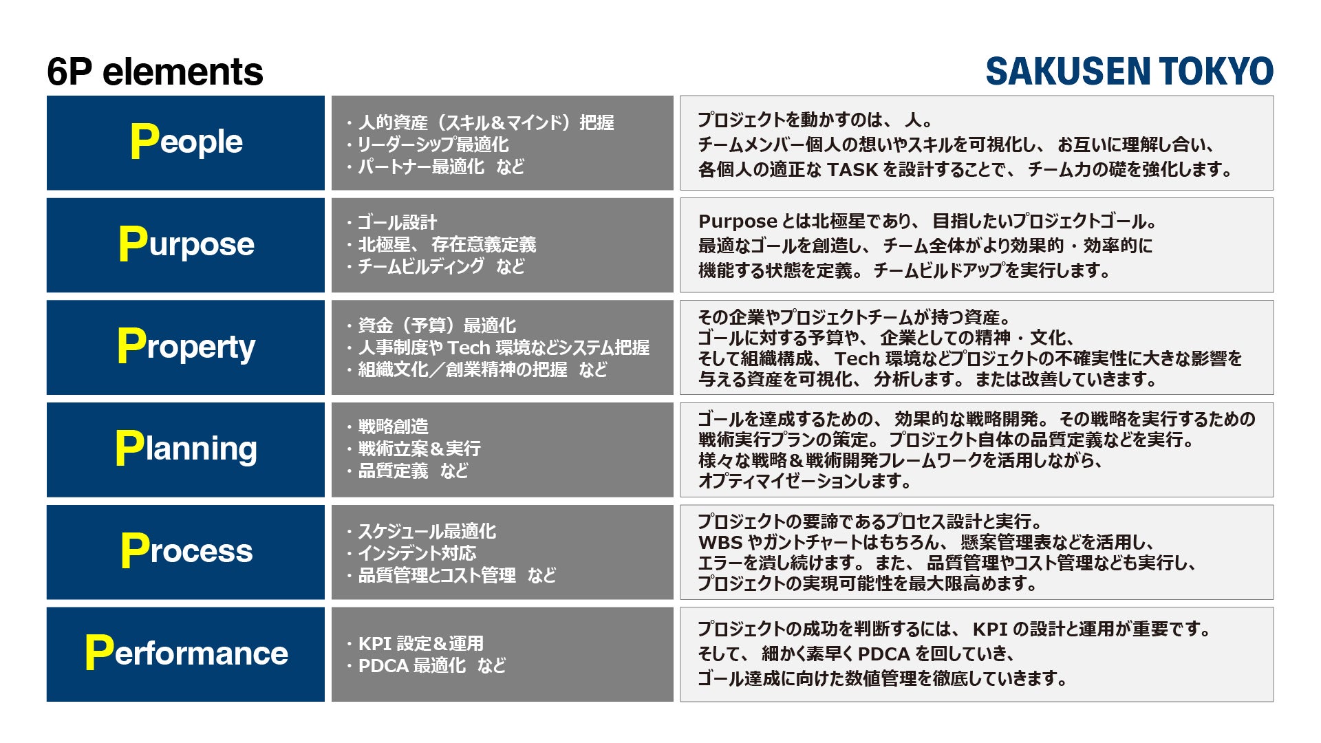 Innovation PMO team.である我々SAKUSEN TOKYOは、この不確実性に打ち勝つために、6P elementsというプロジェクトマネジメントのためのフレームワークを開発しました。プロジェクトを6つの要素(element)に分解。それぞれの要素の問題点や長所を発見し、6つのすべての領域で問題解決を実行します。さらに、それぞれの領域を相互連携させながら、プロジェクトを成功に導くフレームワークです。以下6つの要素で構成されています。