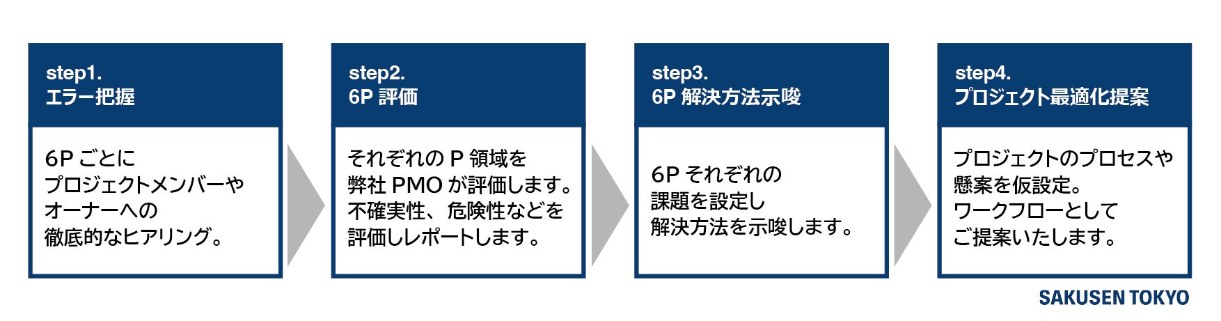プロジェクトの成功は、不確実性にいかに打ち勝つかがキーになります。6Pの中でエラーがある要素は何か。そのエラーを解決するためには何をすれば良いのか?プロジェクトメンバーやプロジェクトオーナーなどを各elementごとに徹底的にヒアリングを実行し、レポート。それぞれの解決方法を示唆し、プロジェクト全体の最適化までご提案いたします。