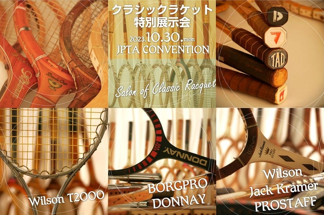 日本プロテニス協会が主催していたセイコースーパーテニスの初期の頃に活躍していた3大スターが使用していたラケットモデルやその他50点ほど懐かしのラケットやポスターなどを展示いたしますので、休憩時間やパーティーをご利用して是非お楽しみください。