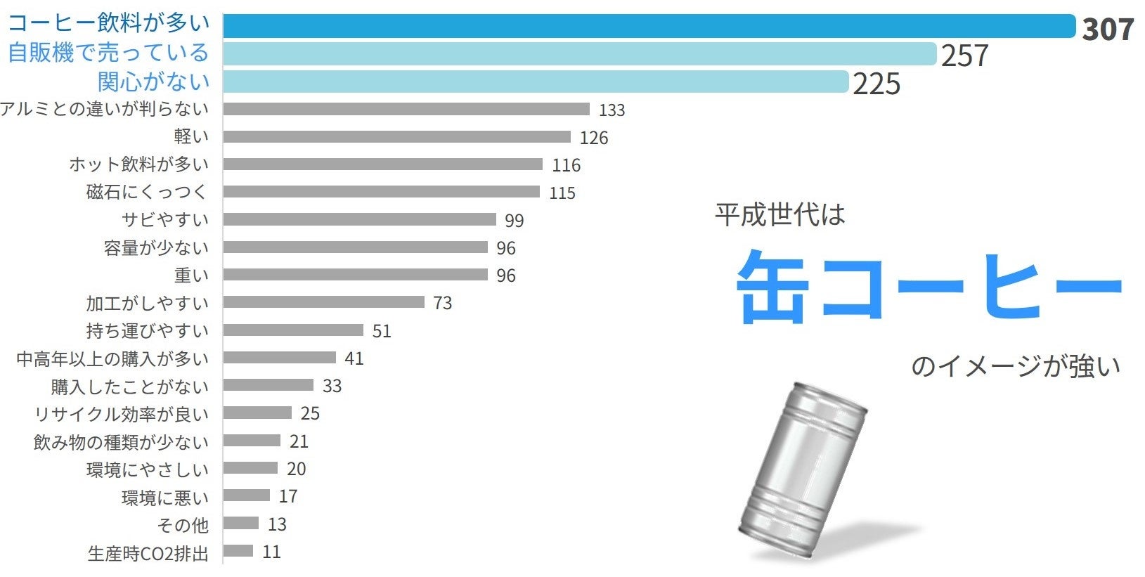 「スチール缶の印象」と質問したところ、「コーヒー飲料が多い」という回答が約3割と最も多く、スチール缶=缶コーヒーを想起する人が多い結果となりました。また、「リサイクル効率の良さ」や「環境に優しい」などのSDGs要素は全体の1~2%と素材の認知が低いことがわかります。