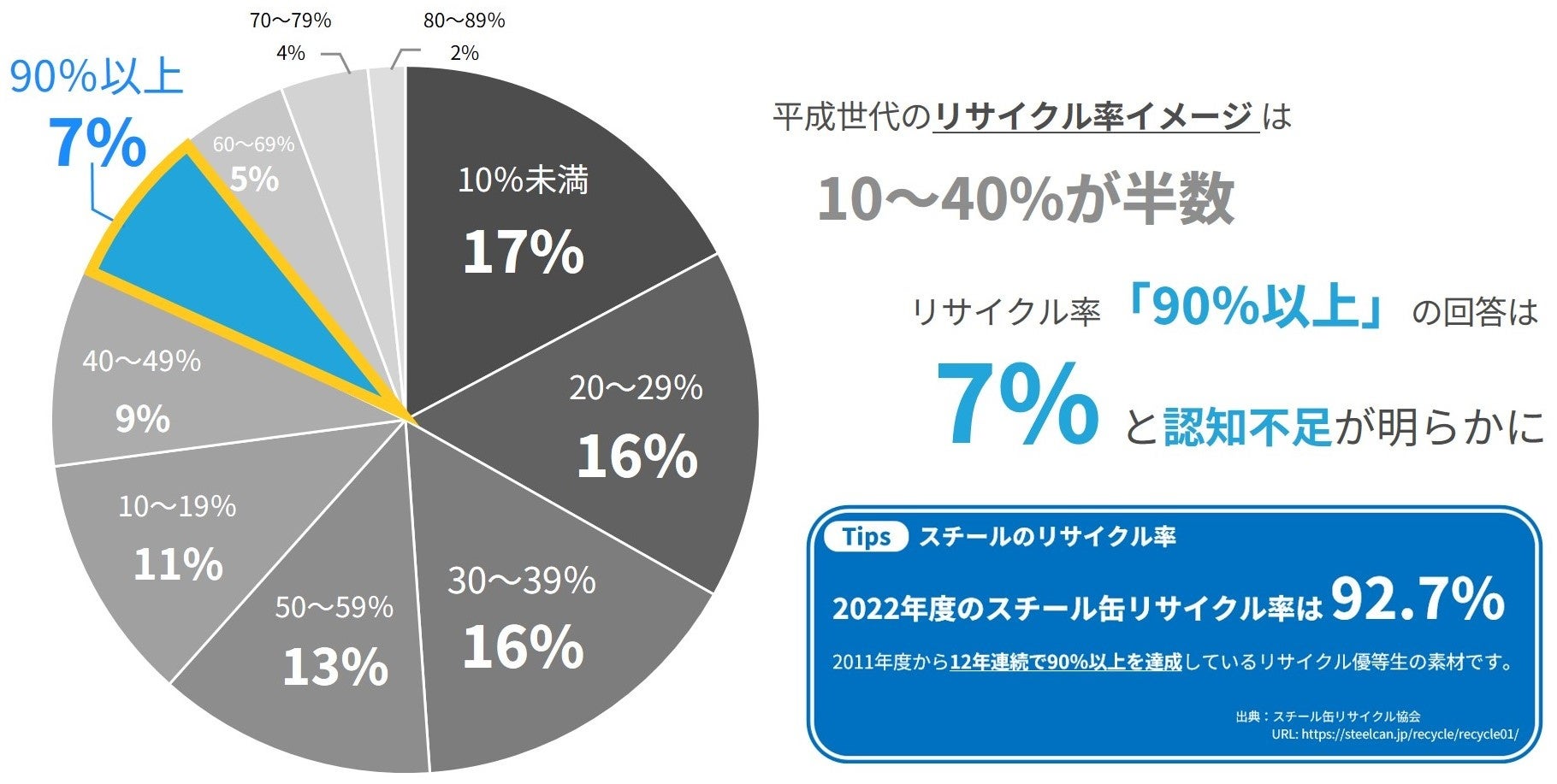 スチール缶のリサイクル率についての質問では「10%未満」と回答した人が最多(17%)の回答となっており、実際のスチール缶のリサイクル率である「90%以上」と回答した人は1割(7%)という結果となり、認知不足が顕著に出ていることがわかりました。