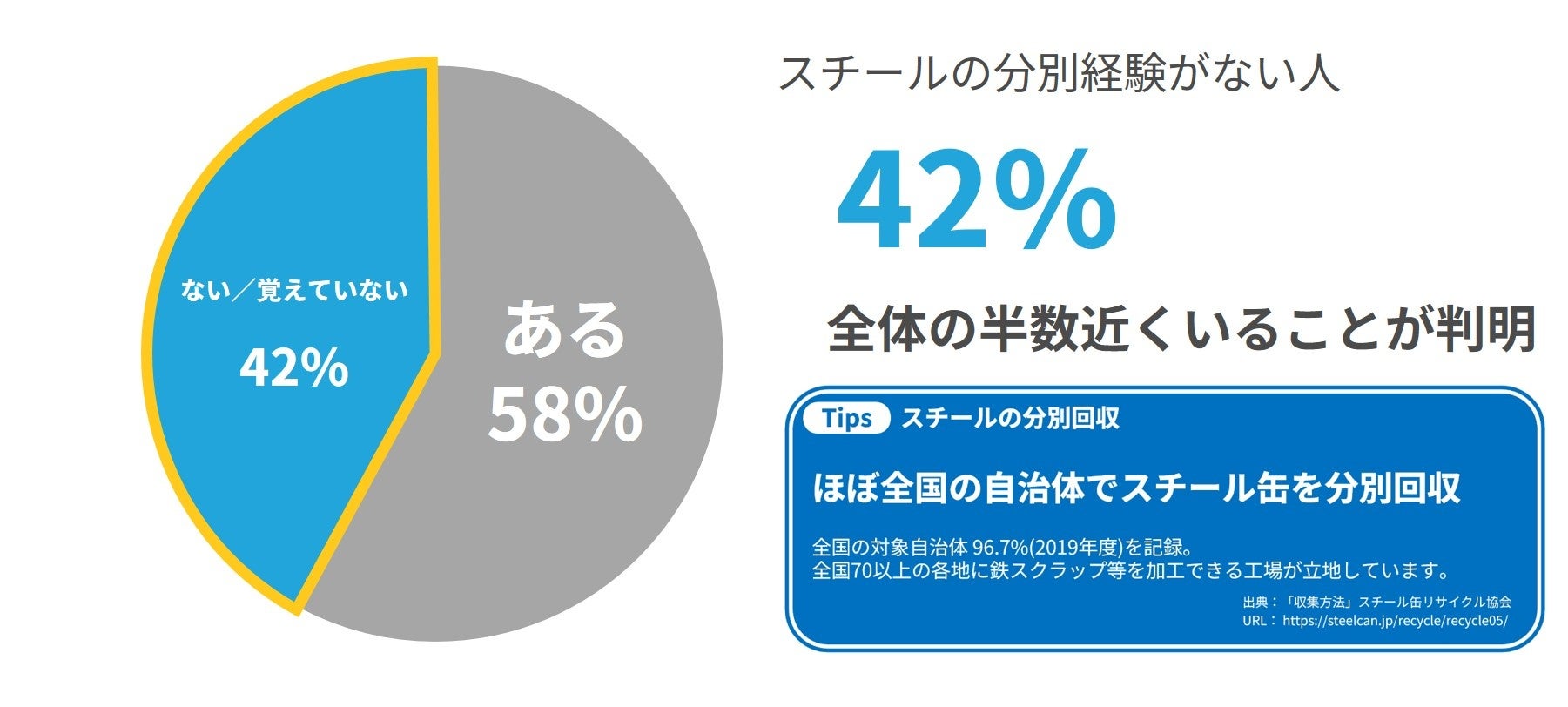 「スチール缶を廃棄する際に分別して捨てたことがあるか」と質問したところ、約6割が「ある」と回答。その一方で「ない/覚えていない」を選択した人は4割以上(42%)とほぼ半数を占める結果となりました。