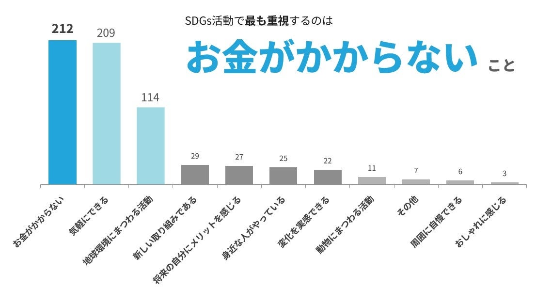 (1)で「SDGsに取り組んでいる」と回答した人を対象に「SDGs活動をする上で最も重視していることは何か?」と質問したところ、「お金がかからないこと」が212人で最多回答となりました。2位の「気軽にできる」と合わせると全体の4割を占めており、日常生活の中で気軽に取り組めるSDGs活動を好む傾向がみられました。