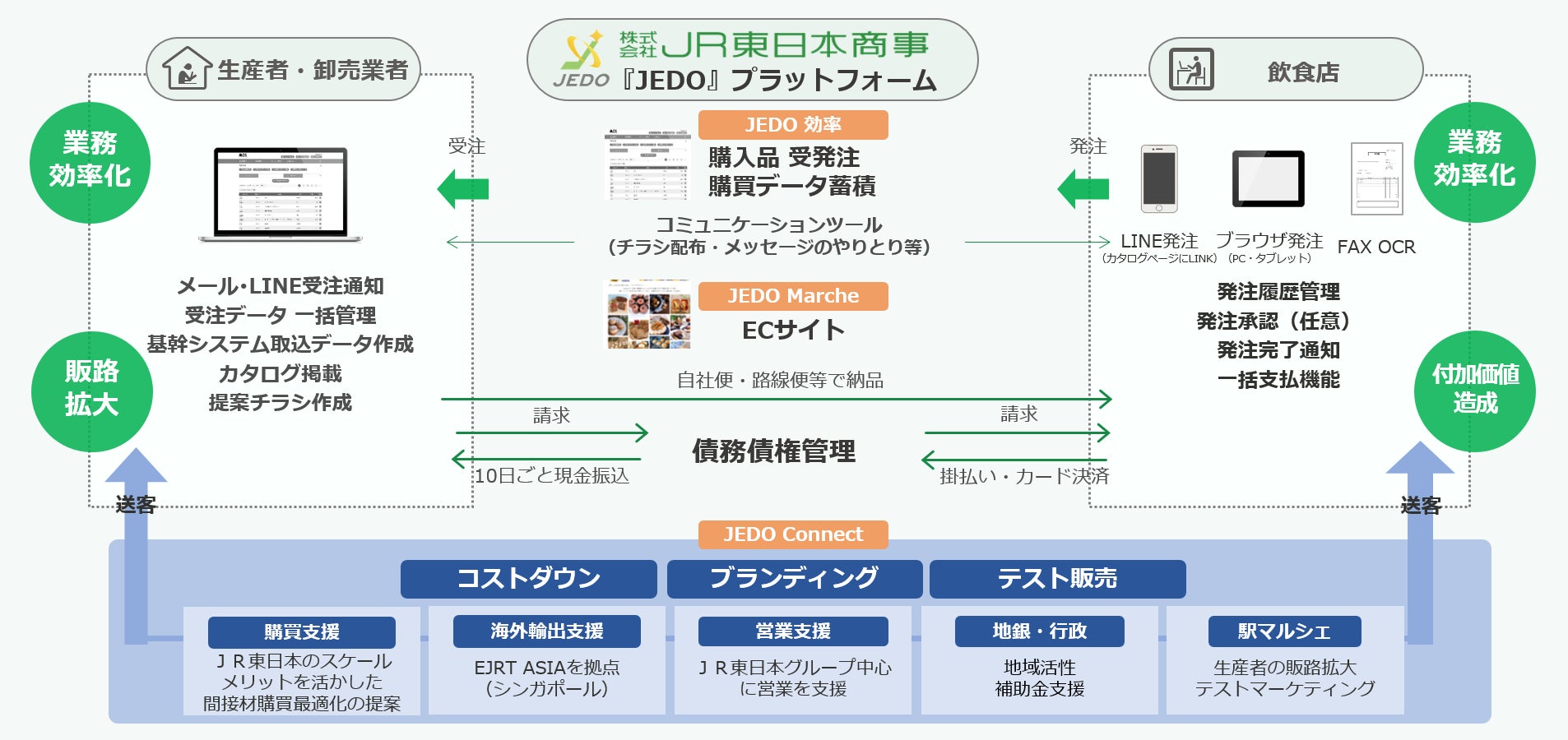 当社は、JR東日本グループの基幹商社としてグループ会社のコストダウンや売上拡大、地域活性に貢献してきました。それらの知見を活かした、生産者および卸売業者、飲食店向けのプラットフォームを構築することで、商社機能のDX化を推進し、JR東日本グループのスケールメリットを共有した業務効率化、販路拡大の提案ができるのではないかと考え、「効率」「Marche」「Connect」を柱とするプラットフォーム「JEDO」を開設しました。
