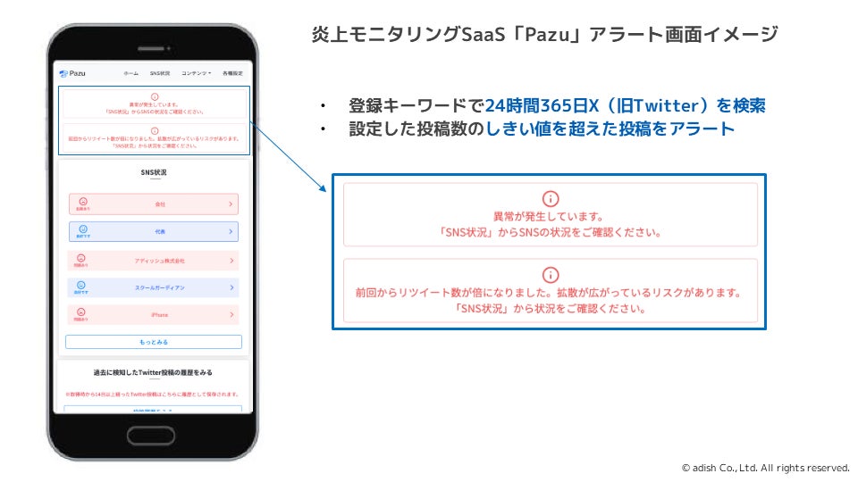 TANTでは、アディッシュ株式会社が提供する独自の監視システム『Police』を通して24時間365日監視体制をしいている専門スタッフによるSNS監視サービスや、炎上モニタリングSaaS『Pazu』と連携。SNS監視は、SNSリスクとなりうる事象の早期発見、早期対応が可能となる。Pazuは、事前に登録したキーワードでX上の投稿を24時間365日検索、設定したリポスト数を超えた投稿があった場合、アラートが届くツール。これらの、SNSによるマイナスブランディング対策を行っている。