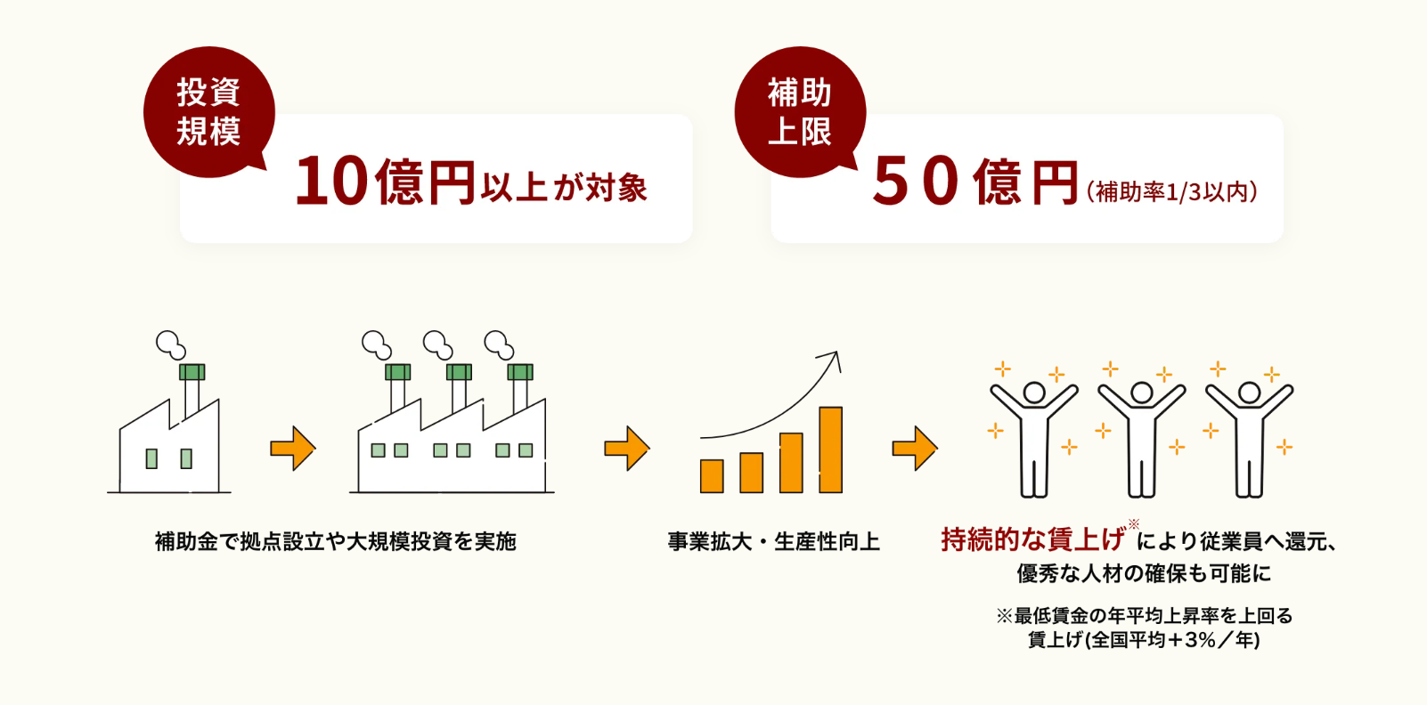 「大規模成長投資補助金」は、地域の雇用を支える中堅・中小企業の人手不足などの課題を解消し、企業がさらなる成長を遂げるために行う工場などの拠点の新設や、大掛かりな設備への投資支援するものです。これにより、地方における持続的な賃金上昇をの実現を目的としています。