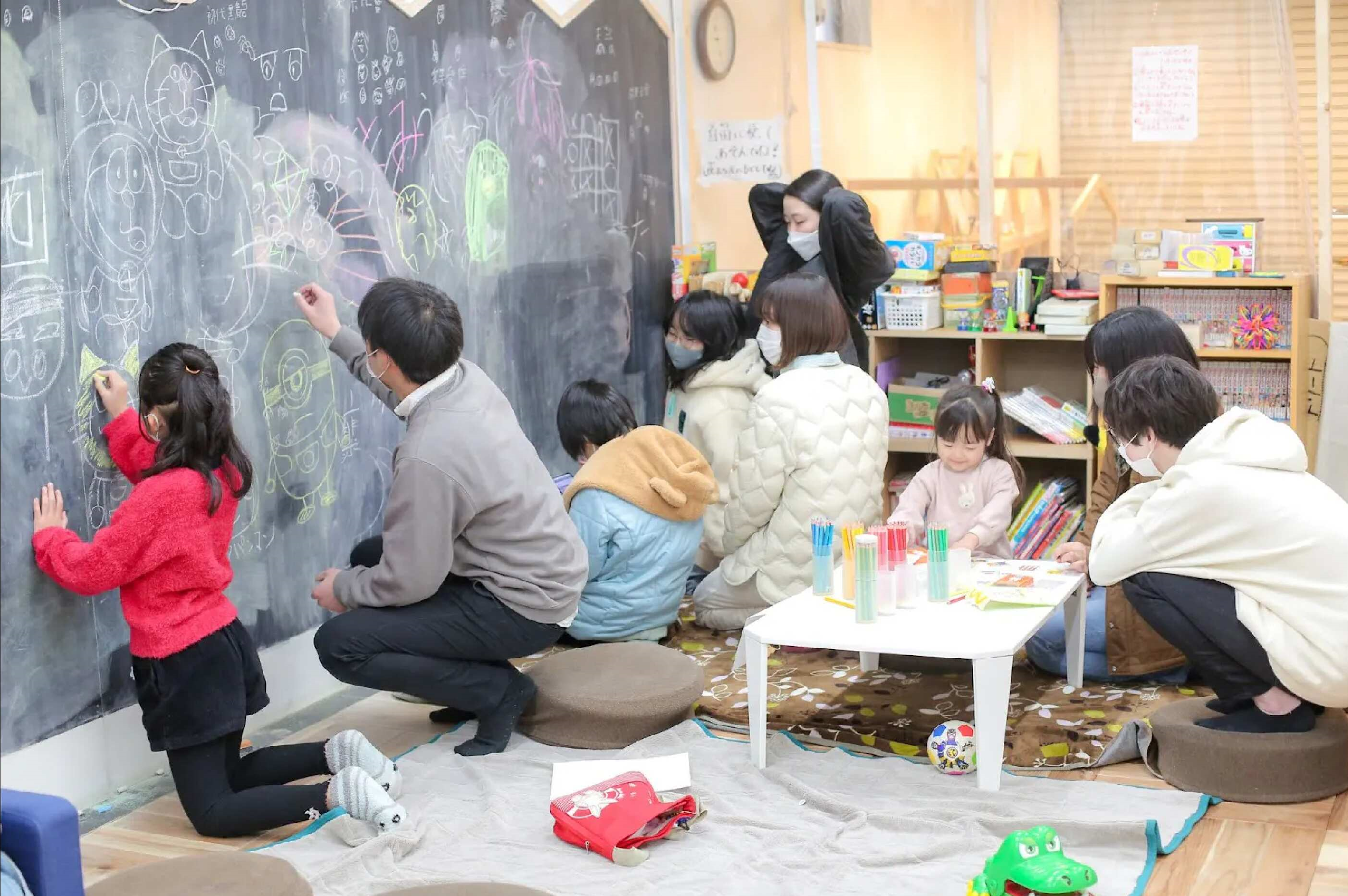 奥には出入り自由なフリースペースを兼ね備えており、黒板やおもちゃで遊んだり、ともだちとおしゃべりをしたり、こどもたちが「何をしてもいいし、何もしなくてもいい」居場所があります。感情図書館hidamariは、このフリースペース内に立ち上げます。