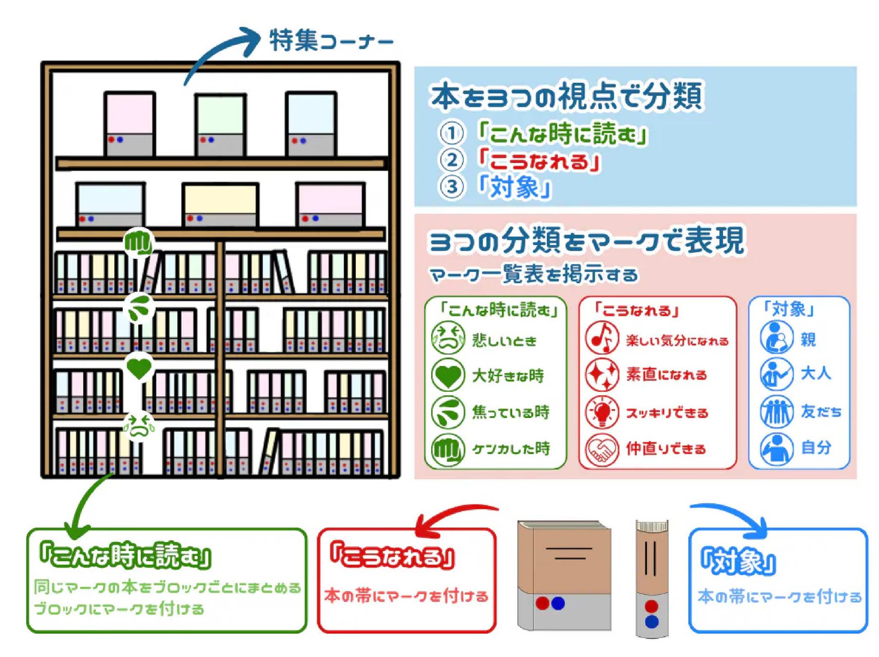 Ⅰ.こんな時に読むⅡ.こうなれるⅢ.対象の3つの組み合わせで本を分類することで、こどもたちへ悩みに合った本との出会いを届けます。