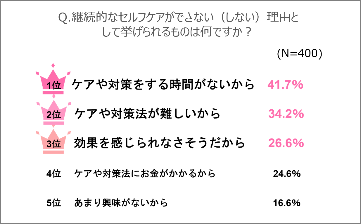 20代女性最多!継続的なセルフケアができない(しない)理由は、「ケアや対策をする時間がないから