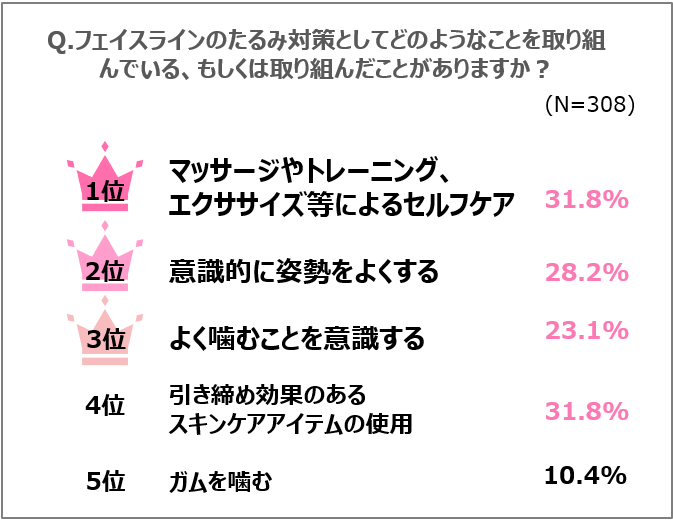 「姿勢の改善」「よく噛むこと」等、日頃からの意識向上でたるみ対策をする女性が多い傾向に。