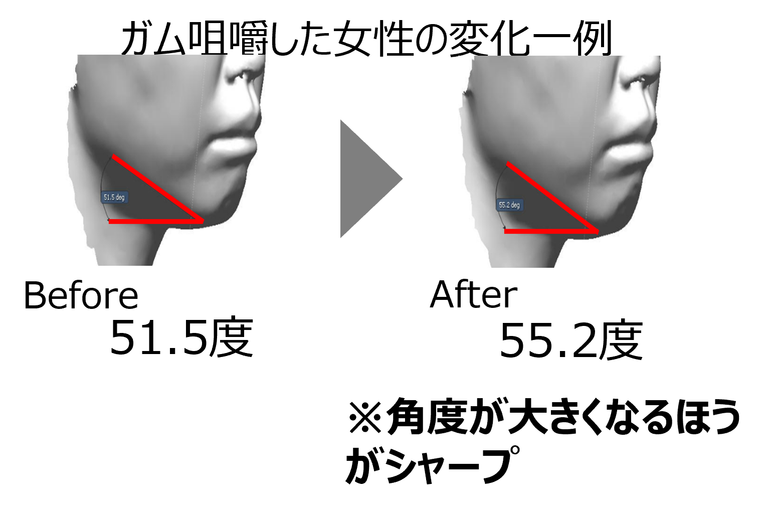 ガム咀嚼は口周りの筋肉や表情筋に作用することが報告されており、継続したガムトレーニングがフェイスラインにも影響するのではと考え、今回の研究を行いました。今回の研究結果から、8週間のガムトレーニングにより左右のフェイスライン角度が増加し、顎下の皮膚のたるみ等に影響することで、フェイスラインが引き締められたことが示唆されました。