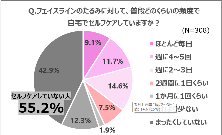 77.1%がフェイスラインのたるみを気にしているが、その2人に1人以上がセルフケアをしていない