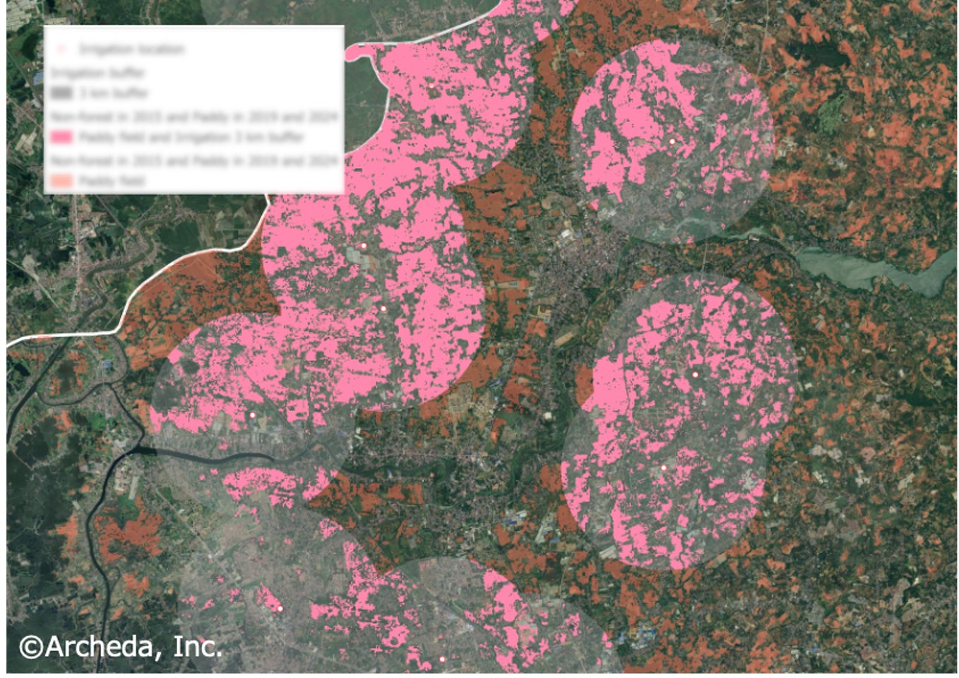 ArchedaとGreen Carbonは、AWD(間断灌漑※3)プロジェクトを通じた温室効果ガス削減に取り組んでいます。Archedaが開発した解析ソリューションは、衛星データと独自AIの活用により効率的にプロジェクトの適地選定を行うもので、AWD技術の最適な展開を支援します。