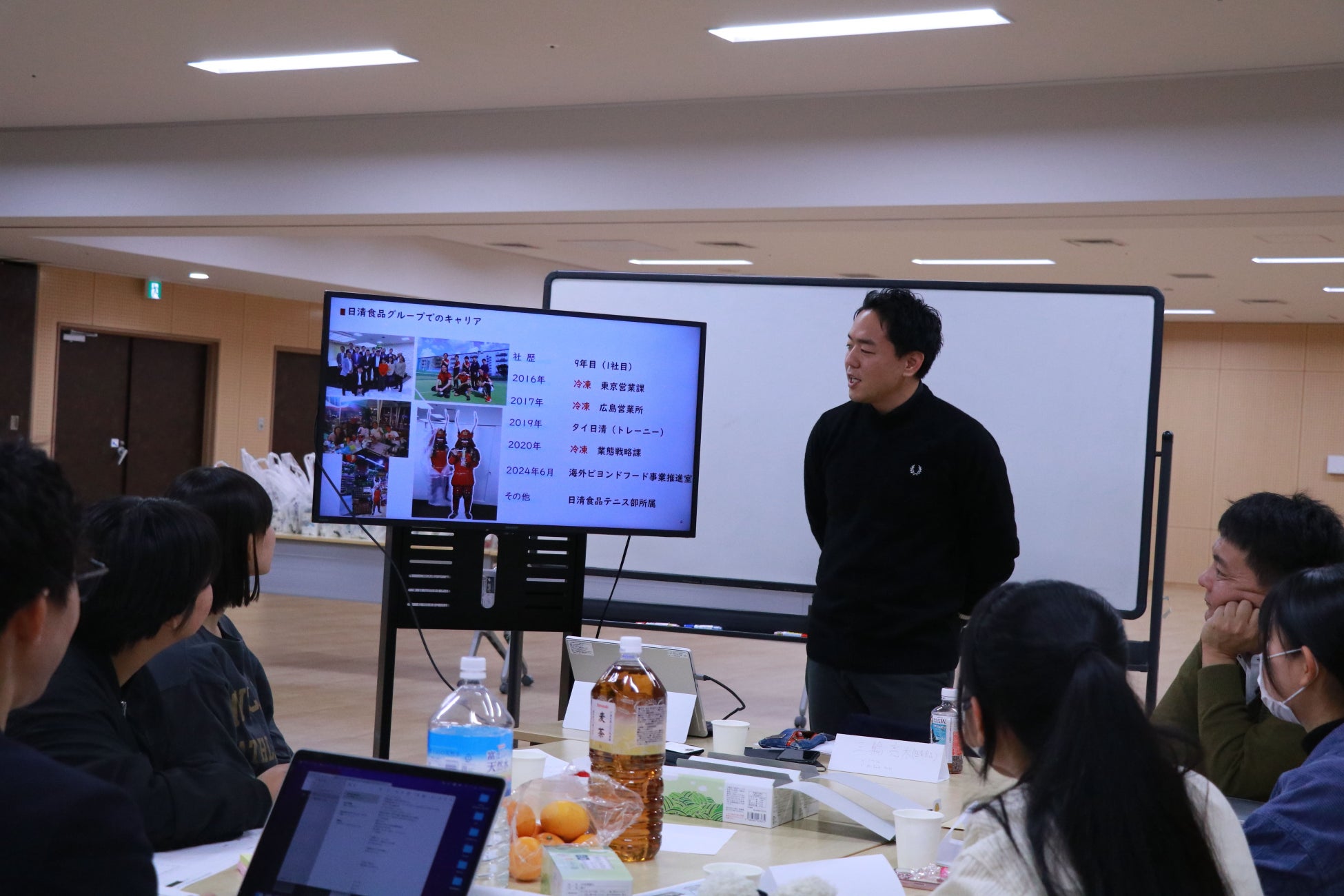 まず、企業人から、どんな仕事をしているのか、そして、なぜ今の会社で働いているのか、何のために働いているのか、について、参加者それぞれからプレゼンを行いました。