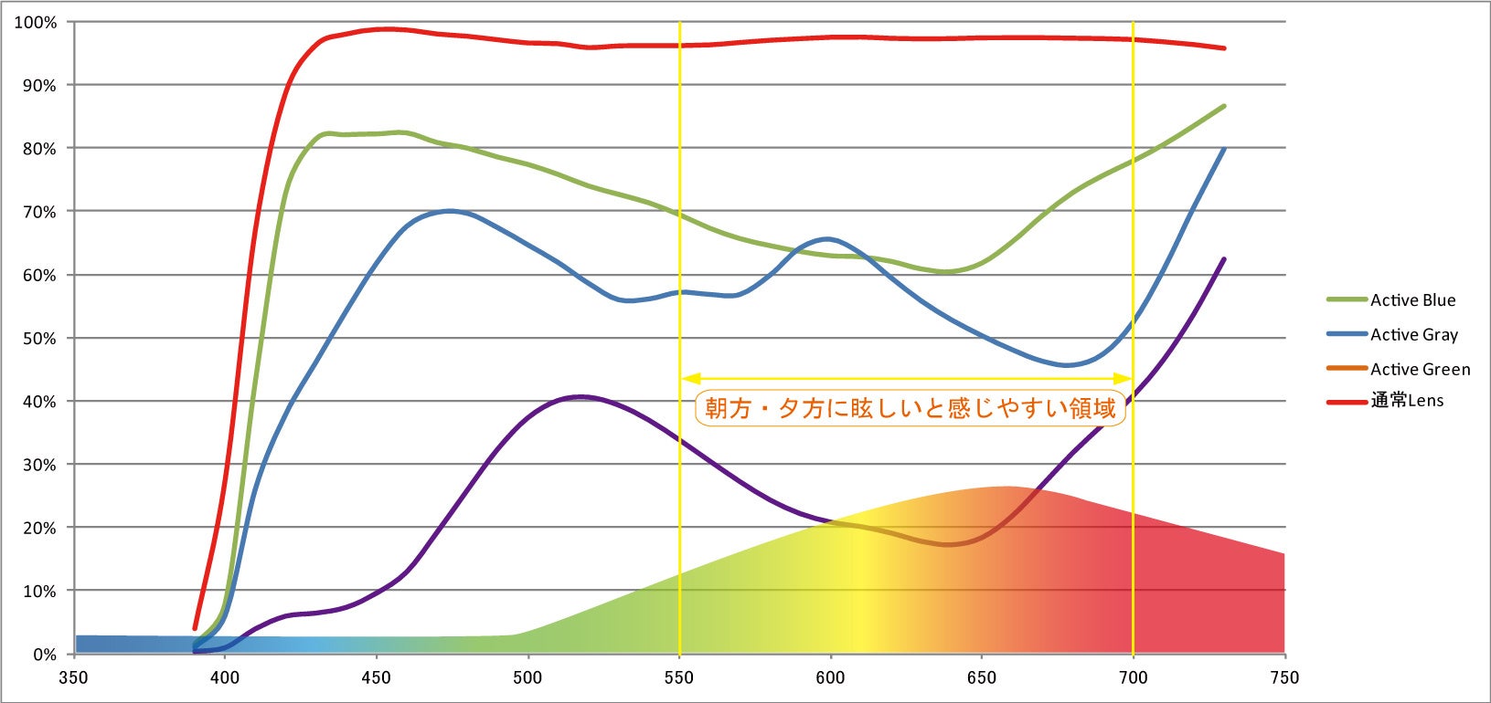 夕暮れ時の赤色光を減光し、地面からの反射光も抑えるため、