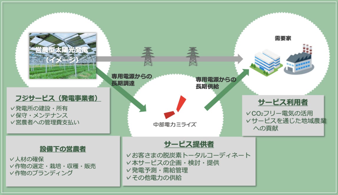 本事業は、電力需要家をローム浜松株式会社、電力小売事業者を中部電力ミライズ株式会社、発電事業者をフジサービス株式会社とするUDAモデルを活用したオフサイトPPAスキームにより成立しました。