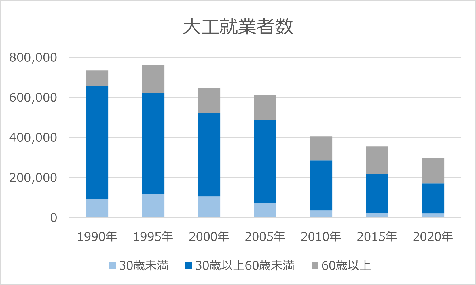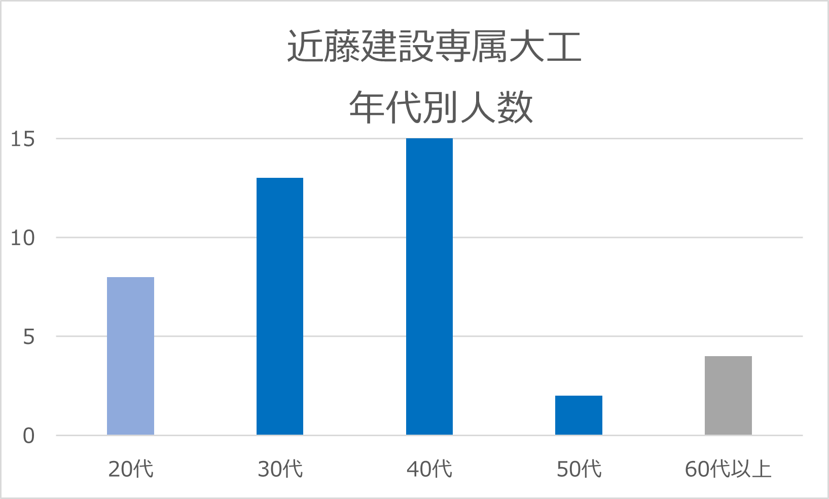 一般的な大工就業者に50代・60代が多いのに対し、近藤建設の専属大工は30代・40代が圧倒的に多くなっています。これは近藤建設で継続的に若手大工の育成を実施してきた結果と言えます。