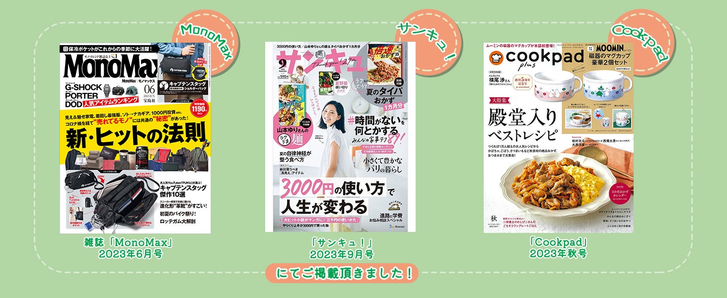 エコジーブランドは2021年の設立以来、生活の向上と環境保護に取り組んでまいります。特に、調理家電は、人気雑誌「MonoMax」(2023年6月号)、「サンキュー」(2023年9月号)、「Cookpad」(2023年秋号)に掲載され、多くの日本の消費者から高い評価をいただいています。