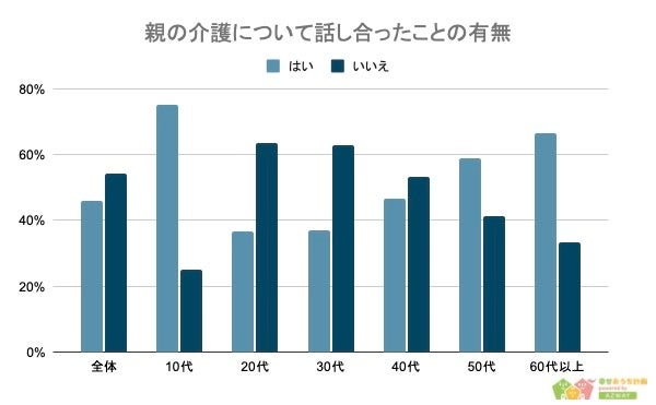 両親の介護について話し合ったことのある人の割合は「約46%」で、20代以降は年齢とともに増加傾向にあることがわかりました。
