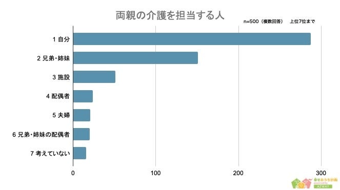 続いて「将来的に両親に介護が必要になった場合、主な担当は誰か」について聞いたところ、1位が「自分(287人)」、2位が「兄弟・姉妹(151人)」、3位が「施設(51人)」という結果になりました。