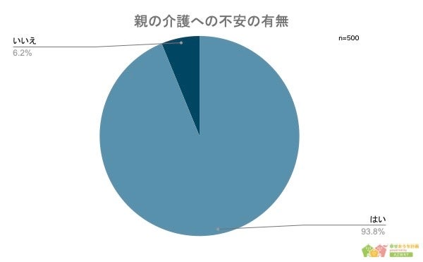 最後に「両親の介護について不安があるか」について聞いたところ、「はい」と答えた人は469人で、全体の93.8%にあたる人が不安を抱いていることがわかりました。実際回答した人からは「家族関係の悪化」や「自分の健康状態の悪化」、「経済状況の悪化」などを不安に思う声が挙がっています。
